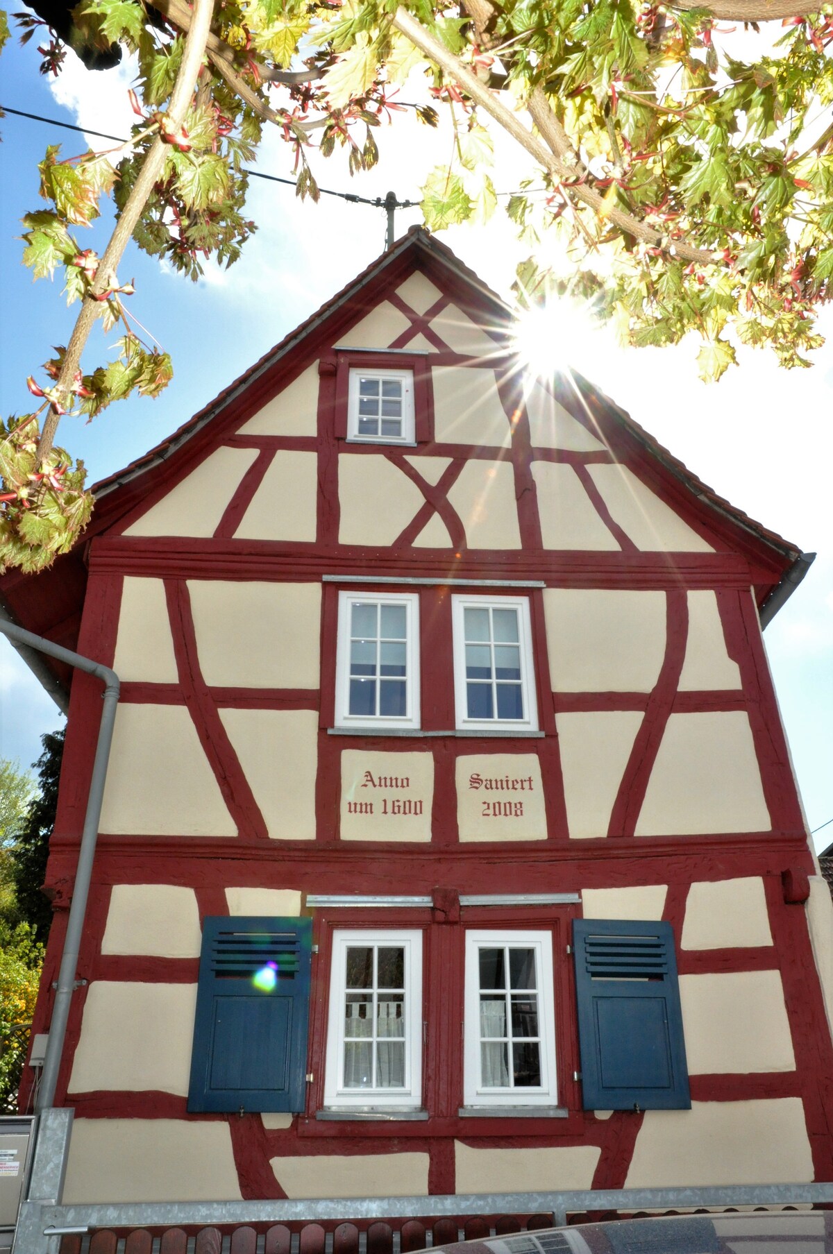 Charming two-bedroom apartment in the historic center of Hofheim-Lorsbach for up to 5 guests. The perfect retreat for exploring Lorsbach's picturesque half-timbered houses, hiking in the Taunus mountains, or taking a trip to Frankfurt (approx. 25 minutes by train to the main station). The apartment features high-quality box-spring beds, a living room with a large, fully equipped kitchen, a spacious bathroom, a private terrace, fast Wi-Fi, and private parking in the courtyard.