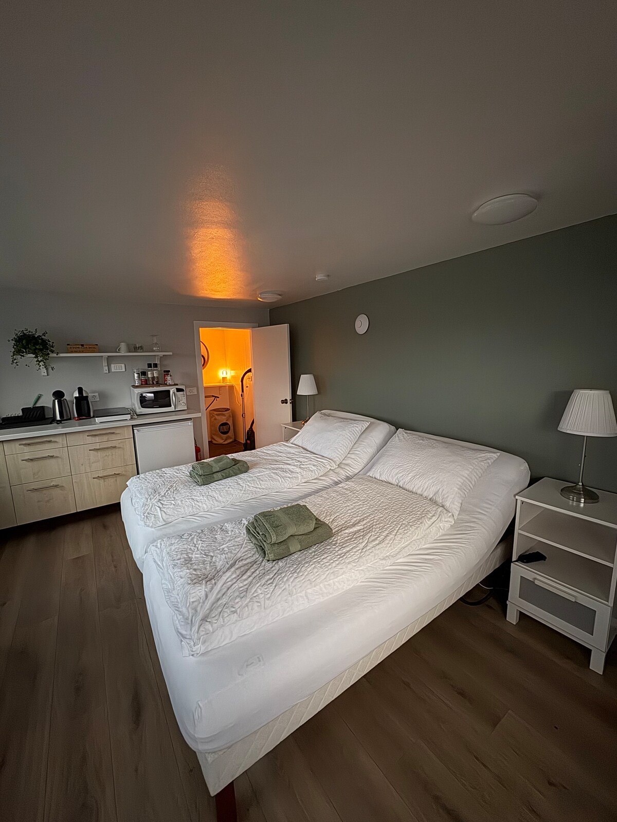 Ný 42 m² íbúð á friðsælum stað í sveit. Tekin í notkun 6. júlí 2025. Tvö svefnherbergi eru í íbúðinni. Svefnpláss er fyrir 4 manneskjur, eitt tvíbreitt rúm í öðru og tvö 90 cm breið í hinu. Lítill eldhúskrókur og stofa í sameiginlegu rými. Baðherbergi með sturtu. Frábært útsýni er í austur, suður og vestur úr húsinu. À sumrin er iðandi og fjölbreytt fuglalíf í umhverfinu og kindur með lömbin á beit í nágrenninu. Auðvelt aðgengi er að húsinu og frí bílastæði. Annað gistihús er í nágrenninu.