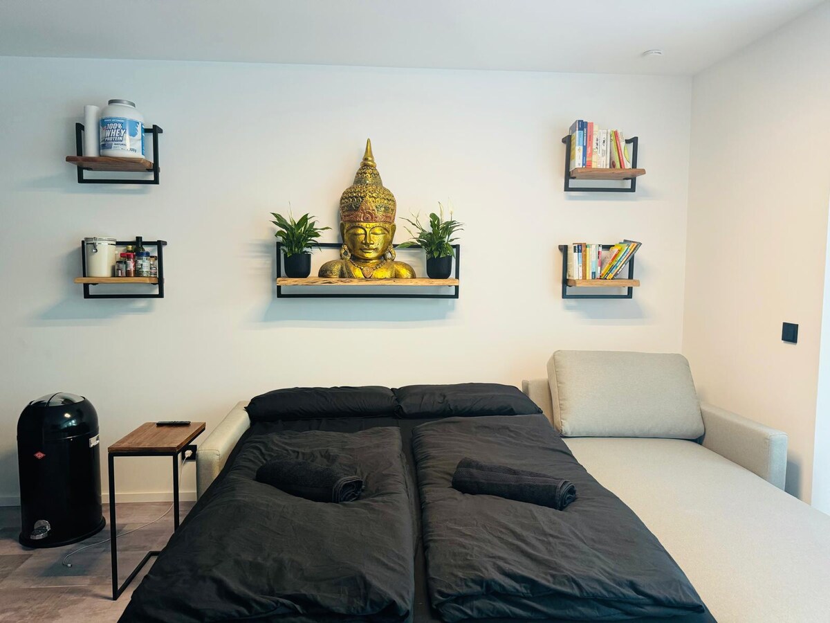 Sunny, exclusive 1-room apartment in Cologne city center for 1-2 people; open floor plan, underfloor heating, comfortable bed (1.40 x 2m), stylish living area, kitchen, high-quality built-in furniture; modern bathroom design with daylight / exclusive furnishings; high-speed WiFi up to 100 mbit/sec; elaborate lighting design 3 min. to the shopping streets, restaurants and bars on the doorstep, 800 meters to the cathedral, freeway A57 by car in 5 min. Bookings of 90 days or more on request.