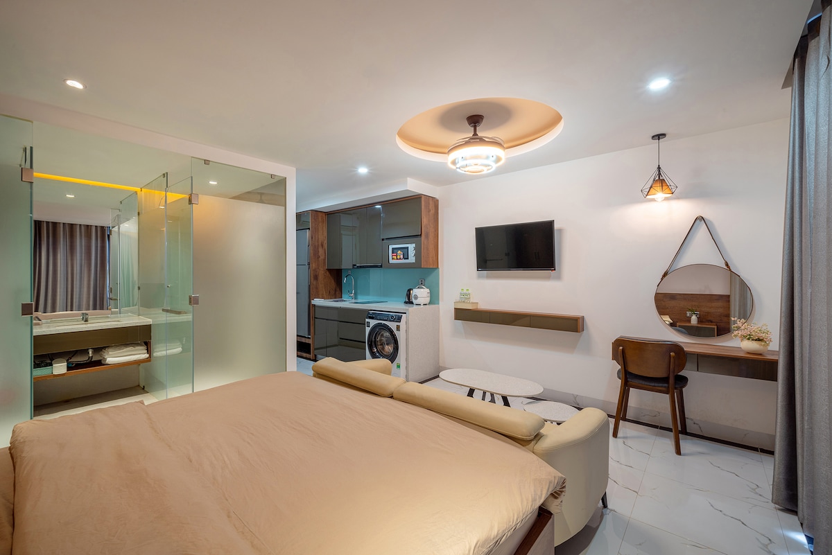 This luxurious apartment offers a separate bedroom and full kitchen, just 500m from My Khe Beach which is the perfect location for your getaway. The apartment is part of a sweet little 3-level villa. As part of its unique charm, you’ll find stairs instead of an elevator — a small detail that makes the villa feel even more homely and welcoming. With the slogan "May Home is where the heart is”, you’ll always feel warmly welcomed by our team, with a stay that’s comfortable and unforgettable.