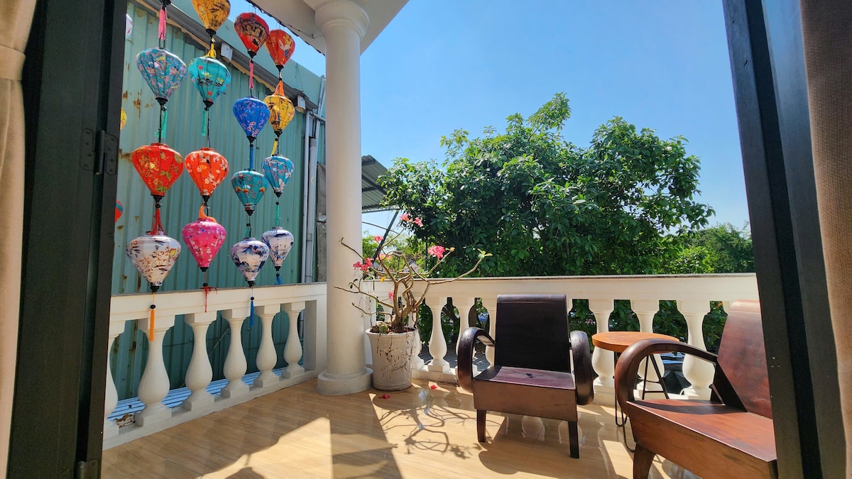 # Room 102 – 1st Floor with Pool & Garden Views # Private balcony room overlooking the villa’s pool and tropical garden, located beside a stream in Cẩm Thanh. Includes: - Free daily breakfast - Complimentary 4-seat car transfer from Da Nang Airport/Train Station (stays of 15+ nights) - 3 km to Hội An Ancient Town | 5 km to An Bang Beach | 2km to Bay Mau Coconut Forest | Bà Lê Marketplace 1km