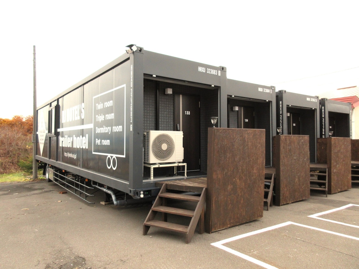 40feetトレーラーホテルです。べッド6台ありファミリーや友達と貸切できます。室内には、ベッド6台とバスルーム、トイレ、洗面台2台、電子レンジ、電子ケトル設置と冷暖房エアコンを完備しています。