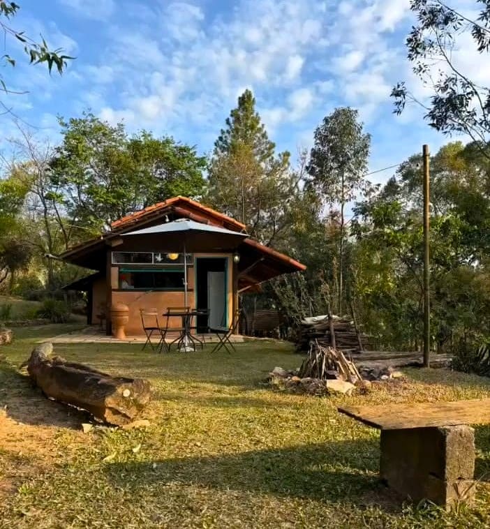 Chalé charmoso, rústico e ecológico (bioconstrução com paredes de terra). O chalé fica em área verde e tranquila, dentro de chácara segura (com portão eletrônico), com acesso por estrada de terra (500 m). O local é perfeito para se conectar com a natureza, fazer um detox de telas (não temos TV ou wi-fi), tomar um solzinho, caminhar, fazer uma fogueira no fim de tarde e curtir uma lareira. Espaço ideal para casais com até dois filhos. Localização bem próxima ao centro de Serra Negra (3 km).