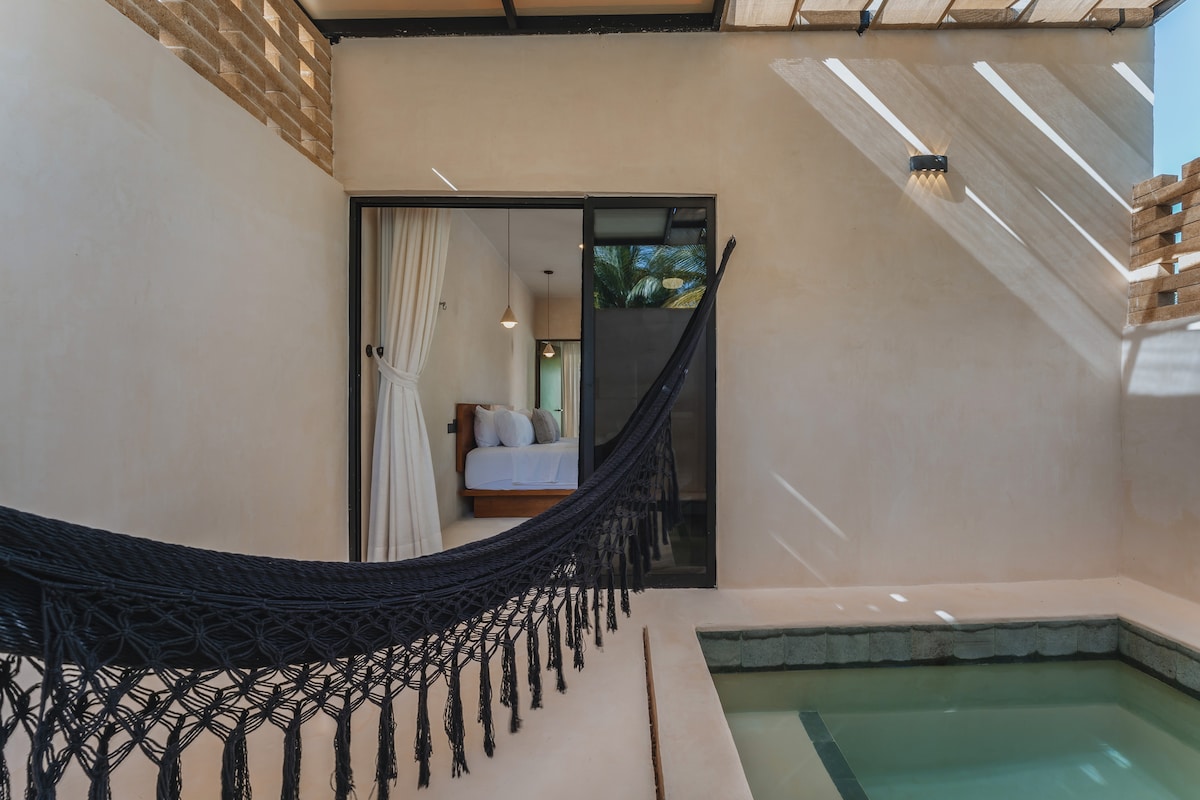 Spacious apartment inside colonial house, perfect for 2. Located east of downtown Mérida, near the ChemBech neighborhood, only a 20-minute walk from the main square. It welcomes travelers seeking calm and introspection. Unique in style and design, with luxury finishes, it guarantees privacy away from the hustle downtown. The apartment is completely private, on the lower level. It has a fully equipped kitchen and living room, a pool, a garden, a terrace, one king bedroom with a marble bathroom.