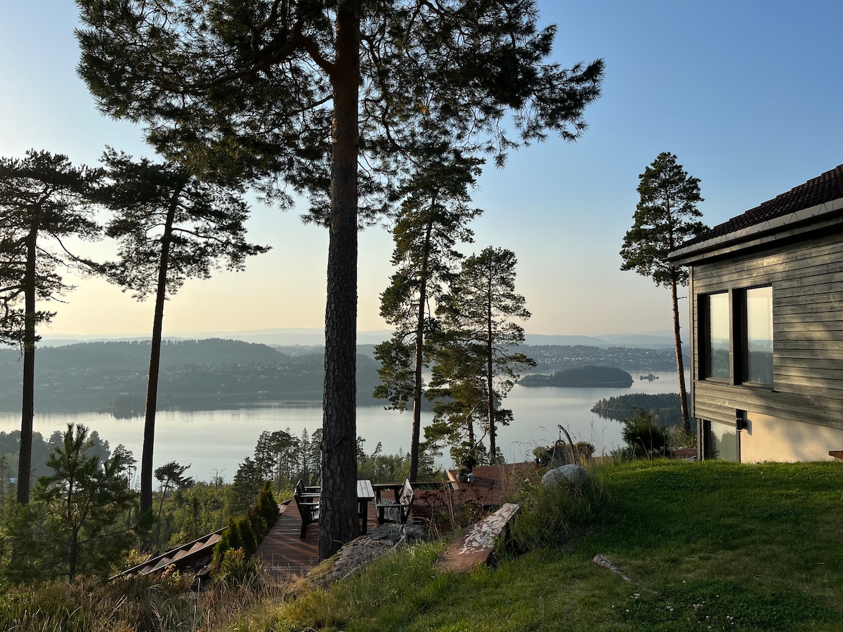 Our house is situated 40 minutes from Oslo on the way to Bergen. It has a magnificent view over two fjords. The house has 3 bedrooms, one double room with a double bed, one 10m2 single rom, and one tiny single room.. The outside has a patio with good space for 4 people for a good meal or the morning coffee. The house has a heat/cool pump in the ground floor. You have the whole house for yourselves, but we live next door if it is any questions. Welcome