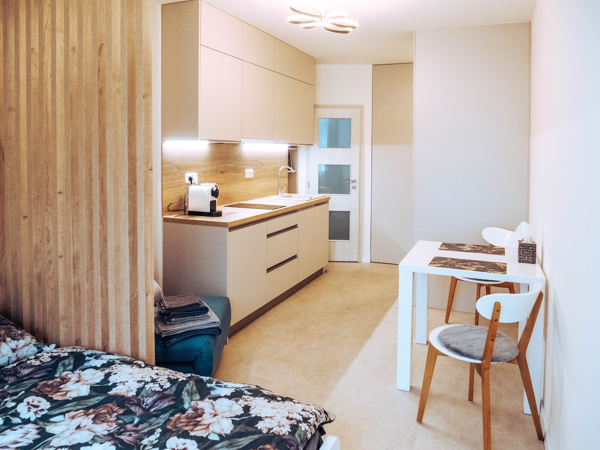 A comfortable studio with a fully equipped kitchen, including all the necessary kitchen utensils for cooking. The kitchen is equipped with 2 induction hobs, a microwave oven, a small fridge, a coffee maker and a kettle. There is a washing machine and a hair dryer in the bathroom. The apartment is also equipped with a safe for the safety of our guests' documents and valuables, a clothes dryer, an iron, an ironing board and a TV. The apartment can accommodate up to 2 guests (full bed 160x200).