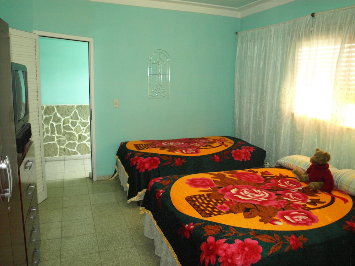 Disfruta de la sencillez de este alojamiento tranquilo y céntrico, que cuenta una cama matrimonial en cada una de sus dos habitaciones. Localizado en un tercer piso y completamente privado. A solo minutos del centro del pueblo caminando ( a 10 minutos del parque Calixto Garcia y la Bodeguita del Medio). Con vista de la Loma de la Cruz desde el balcón. Amplia variedad de Paladares/Restaurantes cercanos a distancia que puedes caminar.