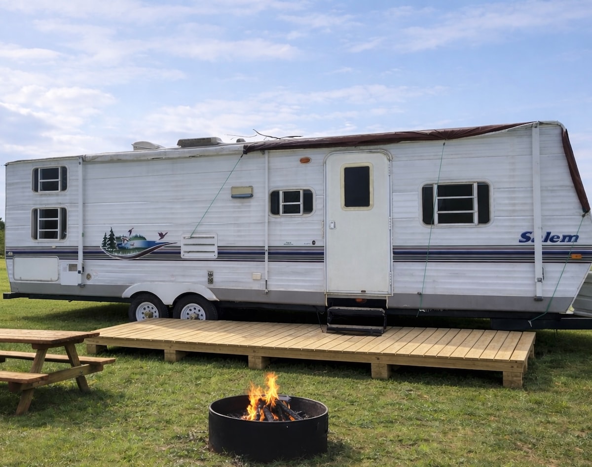 -We invite you to come be a happy "Glamper" and have a unique farm experience. The Glamper has everything you will need. It is located near our barns and play area, has a stunning view of the valley. -5 minutes from Lime Lake, 20 minutes from Ellicottville, 45 minutes from Buffalo, and 65 minutes from Niagara Falls. -Outdoor area includes a picnic table, small grill, and a fire pit. Tents are allowed (tent rental available at the farm).