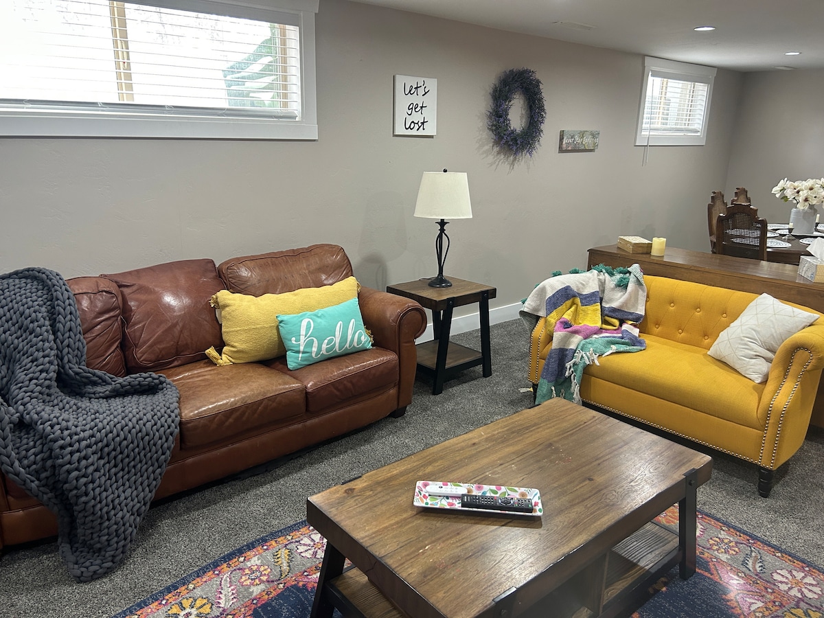 This stylish place to stay is perfect for families or small groups. Close to the mountains downtown Salt Lake City, this space accommodates visitors looking for proximity to everything. Two bedrooms, a spacious living room, and kitchenette make this basement apartment feel like home. We often hear the comment "this is so spacious" :) or "this is more spacious than I realized". It's difficult for the pictures to do it justice but yes, this is a full basement :)
