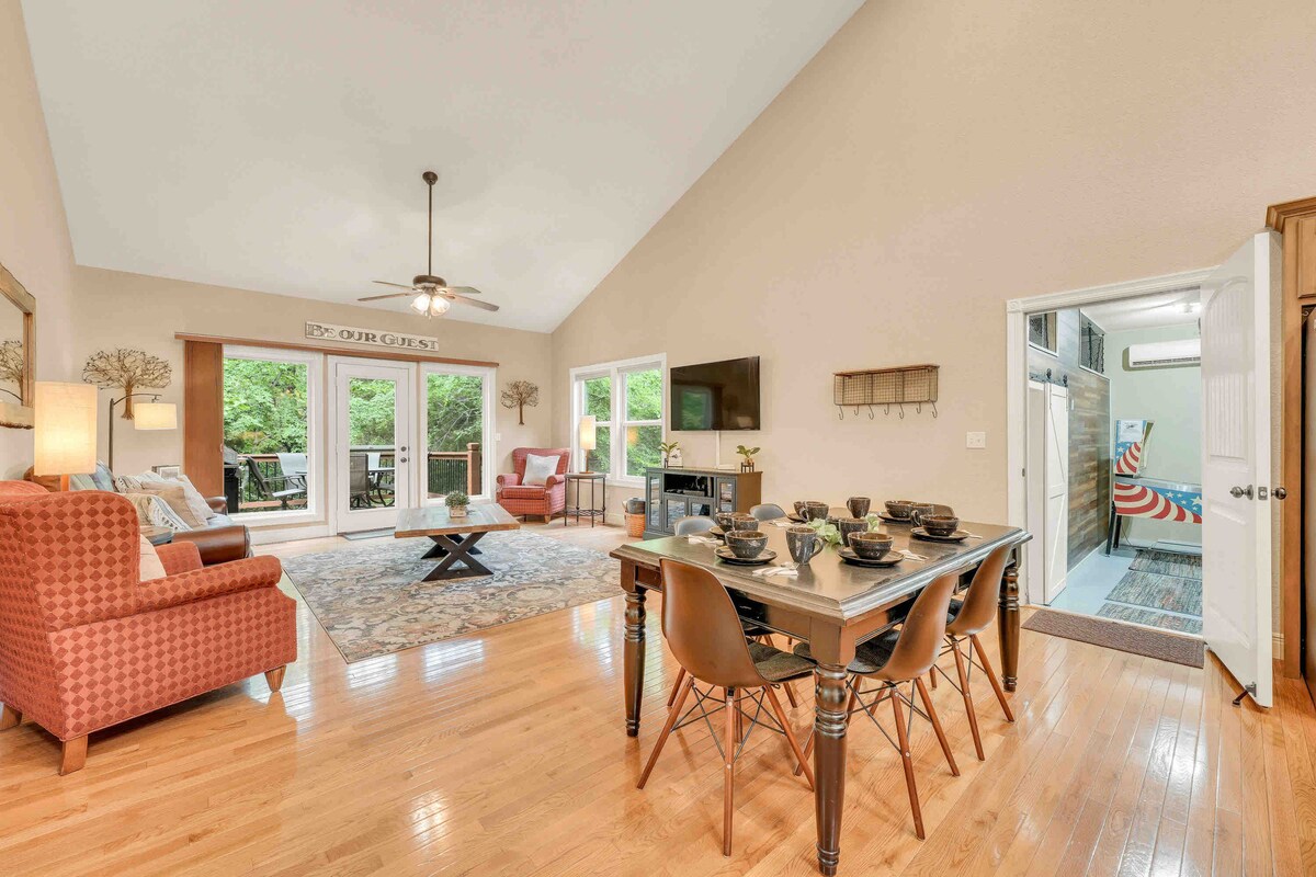 🛑 Tressa Says: "Stop Looking and Book It!" Your 5-star Branson escape! NO stairs. ☕ Your Unhurried Morning Ritual: Start your day with a coffee in the sunroom. Gaze out as the morning light hits the lake, finding a moment of mesmerizing peace. Amenities: • Coffee bar • Luxe king beds • 4 Smart Roku TVs • Fast WiFi • Arcade game Location Perfection! 🏞️ You get a spotless sanctuary with the perfect split: peace and quiet, yet only 12 minutes to Silver Dollar City and 8 minutes to the Strip.
