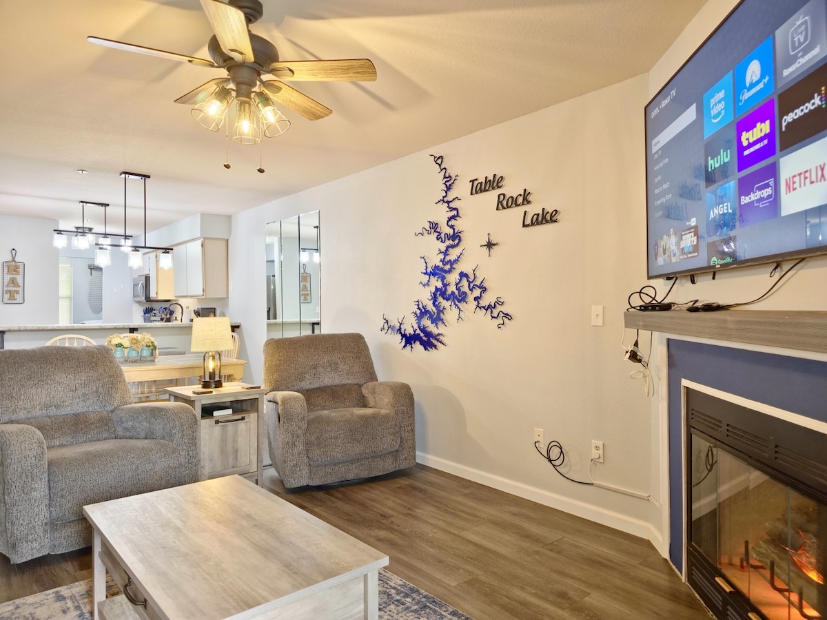 Our spacious 2 bed/2 bath ground level condo is just minutes away from top attractions. Enjoy the Indoor & Outdoor pools, hot tub and sauna. Easy access to the 76 Strip, Branson Landing, Silver Dollar City & Table Rock Lake. The unit has a washer & dryer, well-stocked kitchen, jetted tub, and a veranda with seating for 6. Stay entertained with high-speed internet, 55” TVs with streaming services, board games, and children’s books. The perfct place to rest, relax and create lifelong memories.