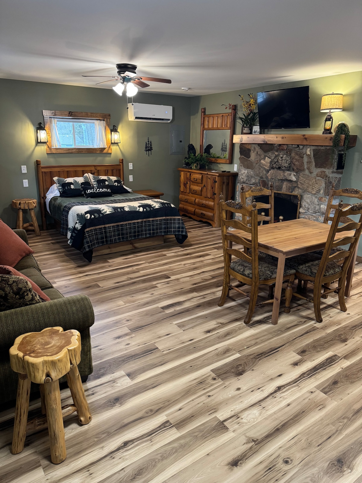Brand New 2025!!! Cabin 18 is a studio style room 1 Queen bed , Pullout sofa, Full Kitchen, Bathroom with large shower, Electric Fireplace. This unit is our most handicapped accessible unit. One level, no stairs, Wheelchair accessible. It is not ADA Certified . Sleeps 2 Comfortably will sleep 4 max with sofa bed $10 per person extra after 2. Location is by Road next to Family unit #17 650 ft from lake. Located at Driftwater Resort Lake Taneycomo