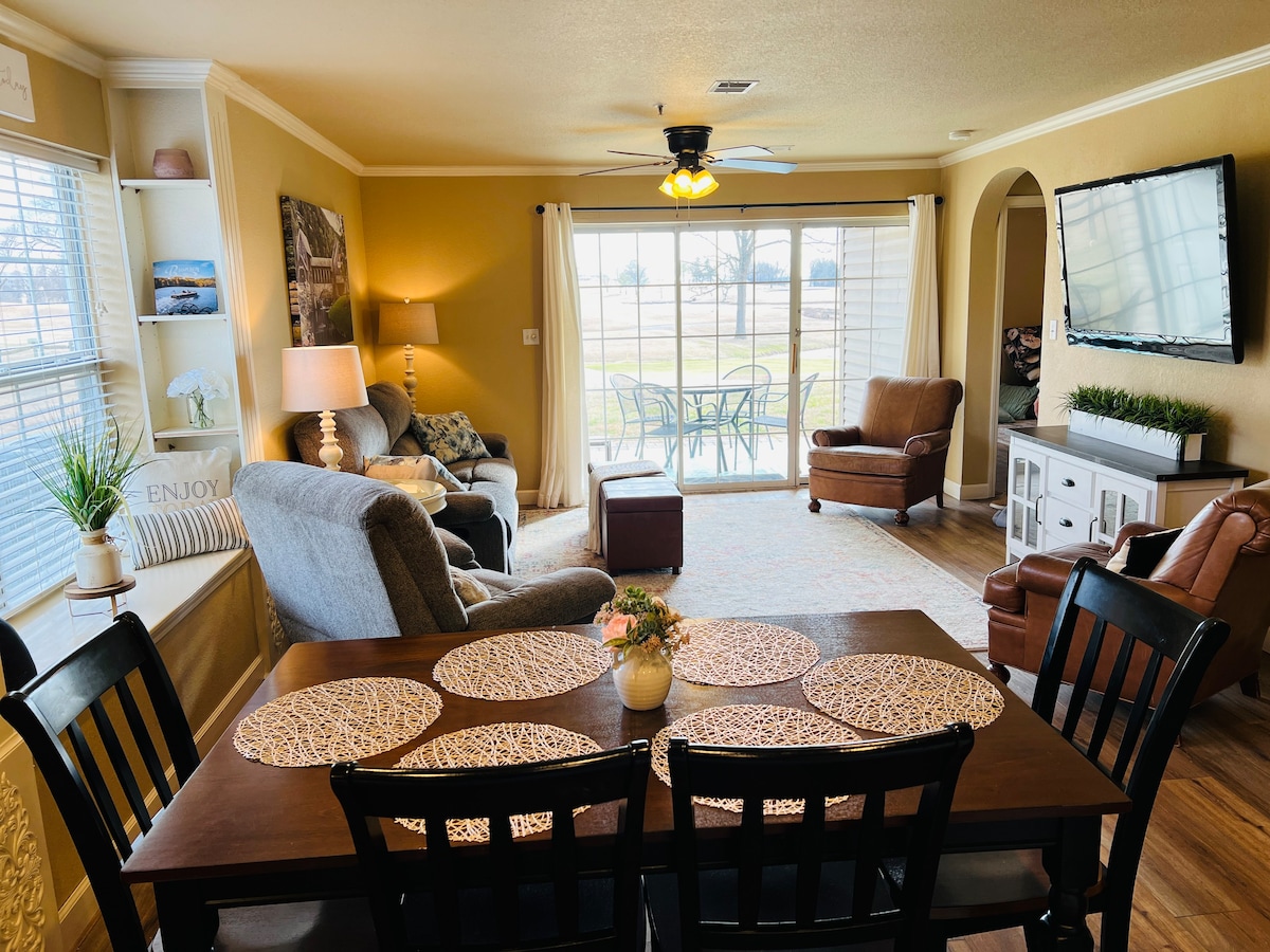 Soak up peaceful golf course and brookside views from this top-floor condo with vaulted ceilings and over 1,000 sq. ft. of space. Just minutes from Table Rock Lake, Lake Taneycomo, and Branson’s top shows and attractions, Brookside Vista Royale features a king suite, queen bedroom, full kitchen, fast WiFi, and private deck. Whether you're here to relax or explore, it’s the perfect retreat after a day in the Ozarks.