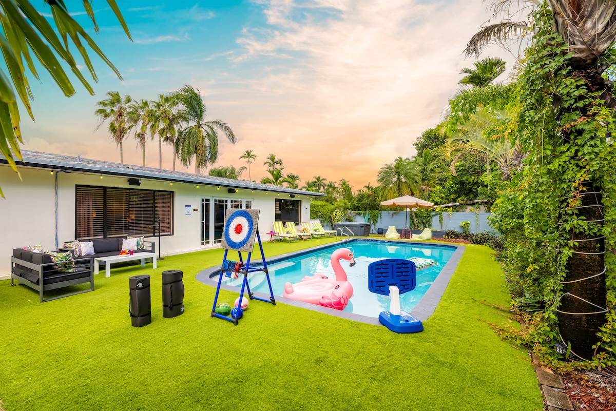 Escape to this family friendly home located in Fort Lauderdale. Conveniently 10 minutes from the airport and 7 miles from the beach, this stylish property offers the perfect blend of luxury and convenience. Inside, enjoy sleek, welcoming colors with spacious living areas and inviting interior. Step outside to a beautifully landscaped backyard with a private heated pool, outdoor dining for the family, and even some cornhole while you wait for your hot dogs off the grill! Your paradise awaits!