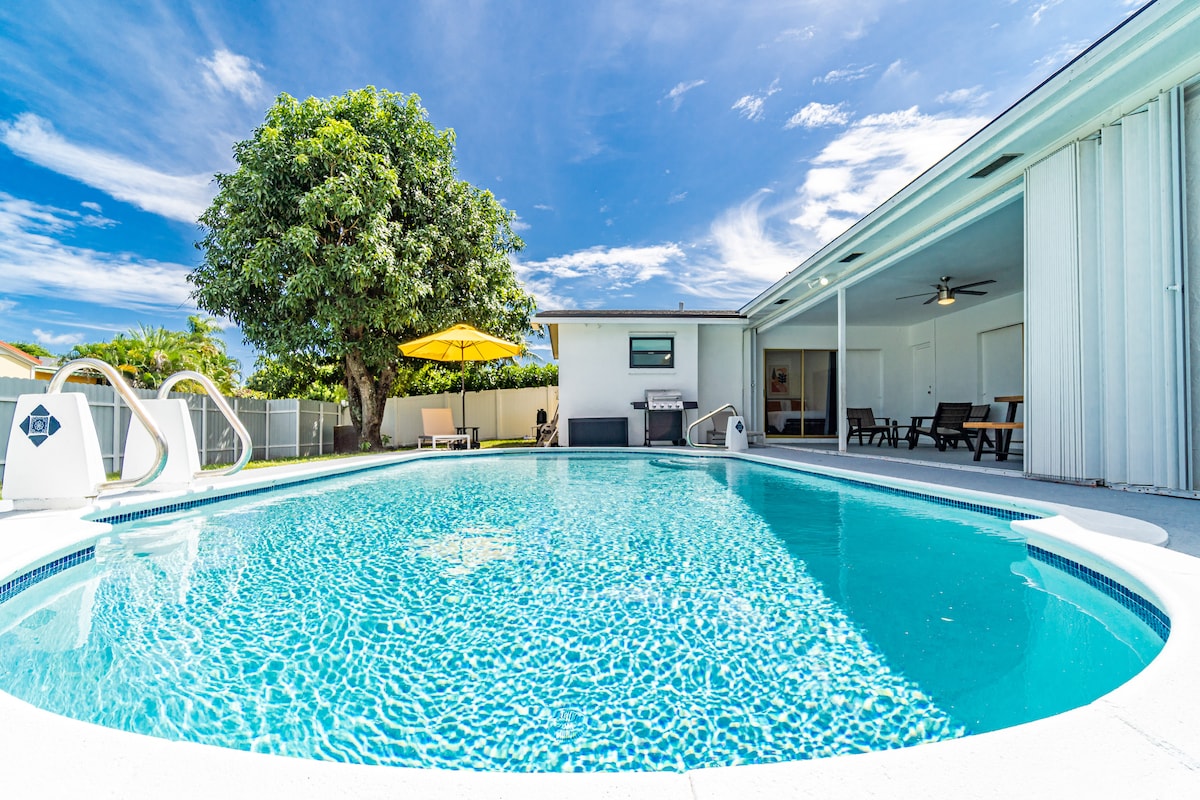 Relax, rejuvenate and experience all that South Florida has to offer in this spacious poolside 4 bedroom 2 bath tropical oasis. Our home features resort-like amenities and comforts to make your stay an ideal home away from home. From chic accents, smart TVs, comfortable beds of all sizes, a fully equipped kitchen with an adjacent dining area. Private backyard filled with tropical plants, new heated saltwater pool, 7 seater Hot Springs hot tub spacious patio area, and a Weber propane grill.