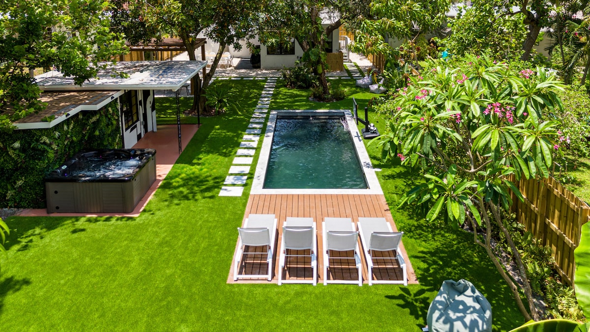 This amazing mini resort has been created with the ultimate comfort of our guests in mind. Enjoy a courtyard and pool deck designed with plenty of outdoor seating and a tiki hut. The property has synthetic grass through out, perfect for kids and family to sit and play on. Super fast Wifi. USB outlets in every room. Super comfortable beds. Smart Tvs that you can Stream you favorite movies to. Washer and Dryer. Outdoor BBQ. Our home is located Minutes from downtown and Hollywood beach/ boardwalk.
