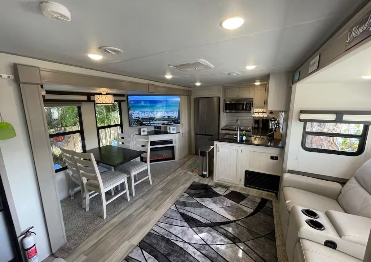 Luxury RV Retreat | 5 Min driving to Beach Experience upscale coastal living in our modern luxury RV, just 5 minutes driving from the beach! This stylish retreat offers plush bedding, a full kitchen, a spa-like bath, and a cozy lounge area. Relax under the stars, explore nearby dining, or unwind in total comfort. Perfect for romantic getaways or solo escapes, this unique stay blends luxury with beachside charm. Book now for the ultimate retreat!