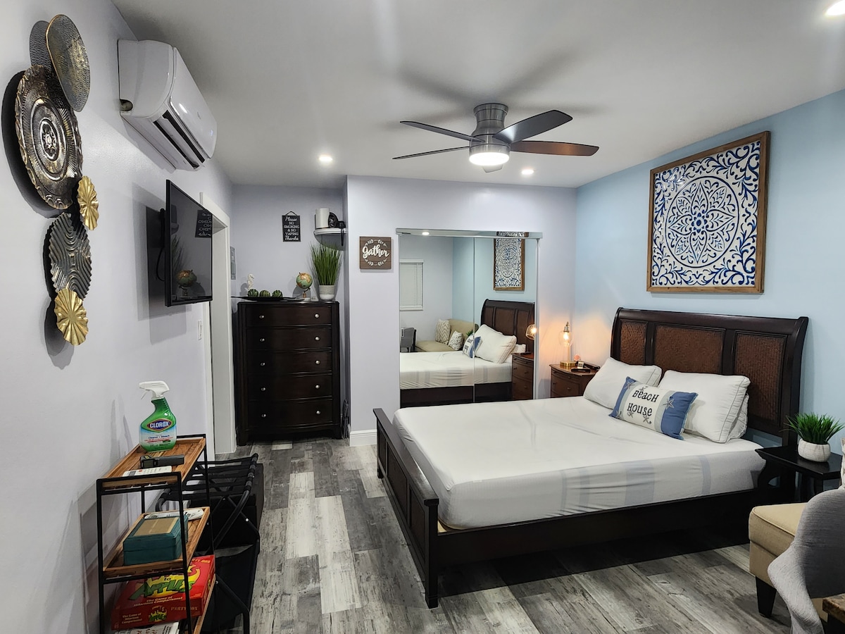 Private studio apartment attached to our home. Studio has bathroom with a (shower included), kitchen area (refrigerator/freezer, microwave, electric stove), large built-in closet, comfortable full-sized bed and 48-inch, flat screen TV. The studio is air-conditioned and has a ceiling fan. Guests have a private backyard patio. There is a washer and dryer and beach cruiser bikes, beach chairs, and umbrella as well. Free on street parking on Harrison Street.