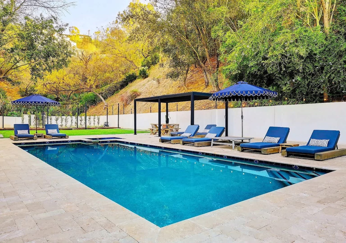 LA Dream Home with hot tub, al fresco dining, fire pit, & movie room! ★ "Great stay. Wonderful clean home up in the hills. Close to everything." ☞ Patio w/ firepit + BBQ + hot tub ☞ Game room w/ pool table + darts ☞ Master suite w/ king + soaking tub ☞ Hybrid memory foam mattress (soft/firm) ☞ 60” smart TV + movie projector ☞ Marshall speaker + Alexa w/ spotify ☞ Private backyard + pet friendly* ☞ 1000 Mbps wifi 8 mins → DT West Hollywood 10 mins → DT Hollywood + Universal Studios **NO PARTI