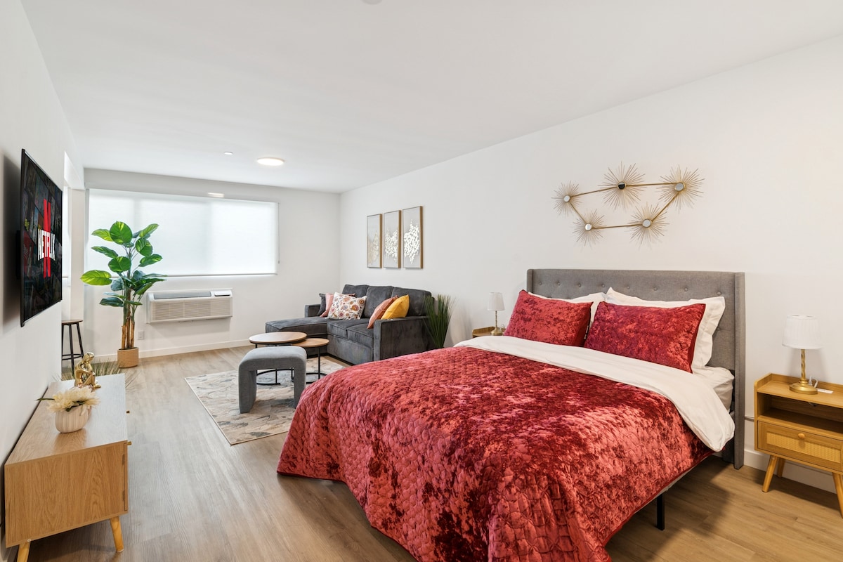 Welcome to your LA retreat! This chic studio apartment in Burbank is just minutes away from Universal Studios, Burbank Studios & Disney. This space offers effortless living. Enjoy stylish furnishings, a fully-equipped kitchen, Wi-Fi & a smart TV, queen beds, on-site laundry, street parking, & ongoing support, convenience is assured. Located across from Whole Foods. You’re at the heart of LA’s vibrant culture. Show up & live the LA dream! Easy Free Street Parking.