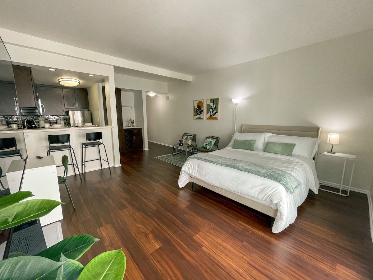 Stylish apartment with memory foam mattress! -Free 1 car assigned gated underground parking included. -Large walk-in closet. -On-site security. -Gym, Pool. -In-unit washer and dryer. (Detergent included). Spacious bathroom with movable handheld shower head. 55’ smart TVs with FREE Netflix. Fully equipped brand new kitchen with dishwasher. Comfortable dining & work area. PROFESSIONALLY DEEP CLEANED & SANITIZED BEFORE EACH GUESTS.