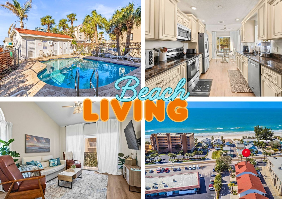 Quiet two story townhome in a no hotel stretch of Indian Shores where the beach stays calm all day. Walk one block to soft sugar sand, enjoy the heated pool and bayfront pier, then take the private elevator home. Townhome has a king suite, a double queen room, fast WiFi, updated interiors, a new sectional, high air quality, and a garage stocked with bikes and beach gear. Perfect for families and couples who want an easy, peaceful beach getaway close to restaurants but far from Clearwater crowds.