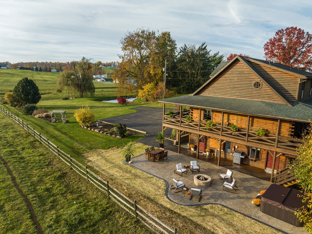 A beautiful log cabin located in Berlin Ohio, the heart of Amish Country. Nestled beside an 8-acre pond with an open dock and adirondack chairs. The outdoors offers other relaxing options like soaking in the hot tub, putting on the putting green, sitting under the pergola with the gas fire pit, swinging on the front porch, or grilling on the patio. Or you can head indoors and relax on the massage chair, play a game, or watch something on one of the 4 TV's, or simply take a nap.