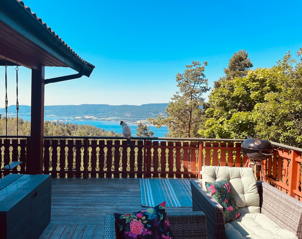 Sjarmerende og hyggelig familiehytte med 3 innendørs soverom, 1 anneks, garasje og 2 utendørs p-plasser. Nydelig utsikt over fjorden fra 3 terrasser, kjøkken og gang. 5 minutters gange til langgrunn strand og badebrygger. Utstyrt med leker og spill for barn og voksne; fuzzball, SUP, redningsvester, krabbefiske m.m. Turområder i umiddelbar nærhet (vann og utsiktsplatå). 5 minutter å kjøre til Sande sentrum med butikker, restauranter, vinmonopol etc. Ideelle solforhold på terassene fra kl 08-22!
