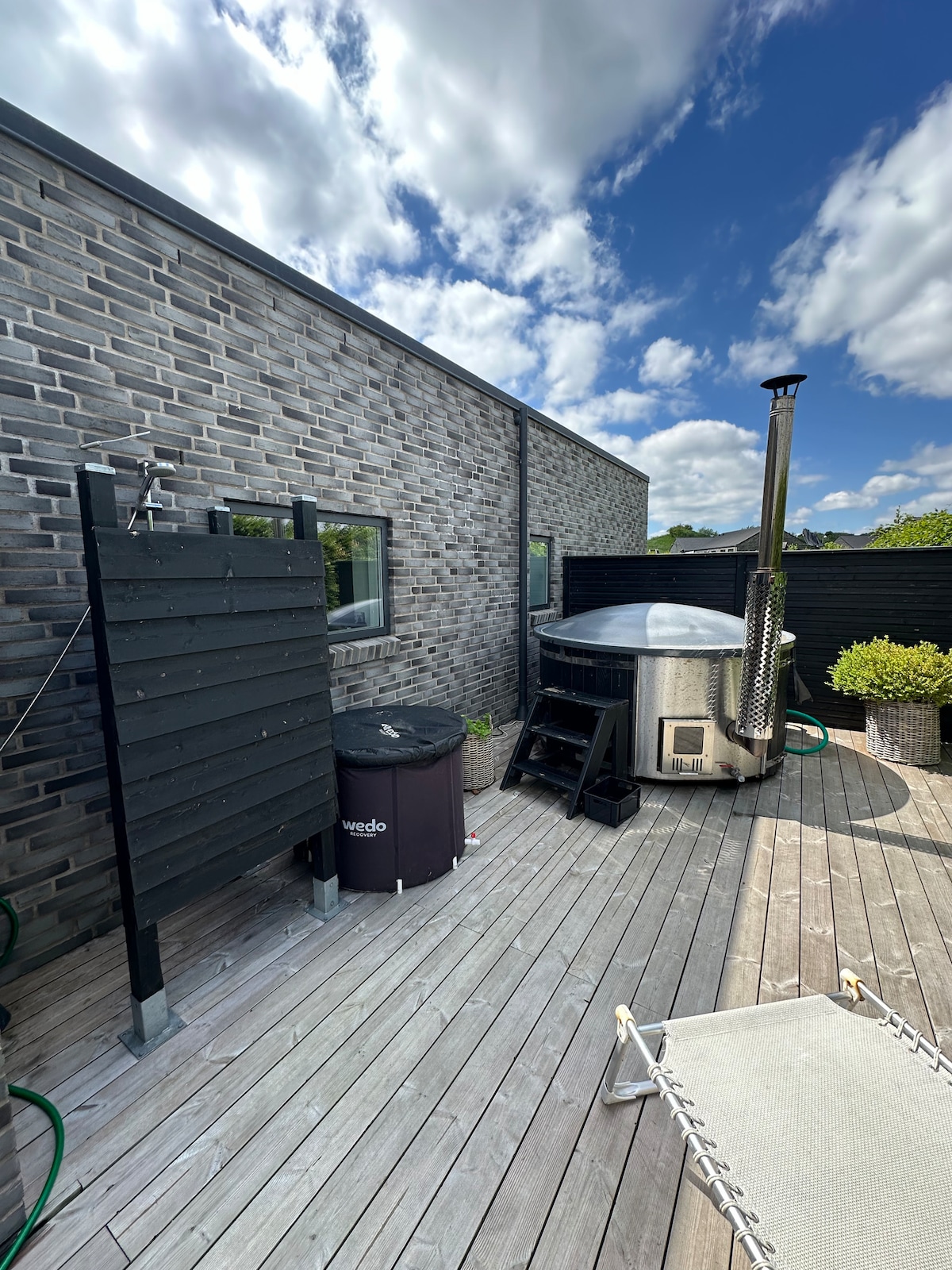 Charming summer house with panoramic views of Helmklit Harbor and Nissum Fjord. Features a spacious living area and kitchen with dining space, 4 bedrooms (2 doubles, 2 singles), a large bathroom, and a guest bathroom. Washer and dryer in the hallway. Outside, enjoy a small covered terrace by the hot tub and a larger terrace with a view. EV charging station available. Bring your own bed linen and towels; duvets and pillows are provided. Electricity billed per consumption: 3,0 DKK/ kwh