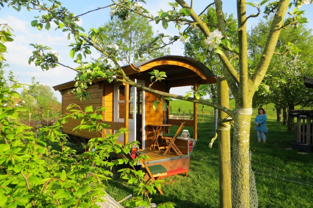 Meine Unterkunft: ein Bauwagen, der einmal ein Gartenhaus war, das auf ein fahrbares Gestell gesetzt wurde. Der Bauwagen wurde mit einer überdachten Veranda versehen, erhielt eine komplett neue, geschmackvolle Innenausstattung mit Beleuchtung, Klappbetten, versenkbarem Tisch etc, und steht nun auf einer großen Schafwiese, zwischen alten Obstbäumen, Buchenhecken und Johannisbeerbüschen, direkt am Elbdeich. Auf dem Grundstück: eine Wirtschaftsküche, eine Sauna mit WC und Dusche für den Bauwagen.
