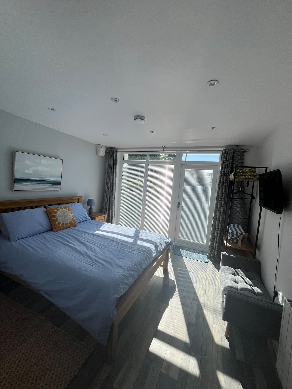 Comfortable studio style room for 2 people located on the ground floor of our family farmhouse. Conveniently situated 3 minutes from junction 5, A55 expressway. Great location for exploring nearby seaside village of Rhosneigr and surrounding beautiful beaches. On route for visiting Anglesey Circuit. The studio has a very comfortable super king size bed that can be separated into two single beds .(Please advice of your requirements). Shower room with underfloor heating.