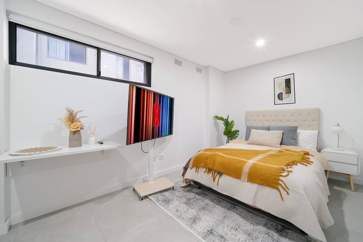 This brand-new, stylish apartment offers a view of the Sydney Harbour Bridge. It features comfy & spacious furnishings and queen-size beds in every room for a home-like experience. The free gym downstairs helps you stay fit while traveling. The prime location boasts excellent nearby restaurants, shopping (DFO), and medical facilities, all within a 2-3 minute walk. It's a 7-minute walk to the train station, close to the Olympic Stadium and Aquatic Centre, and an 18-minute drive to Sydney Airport.