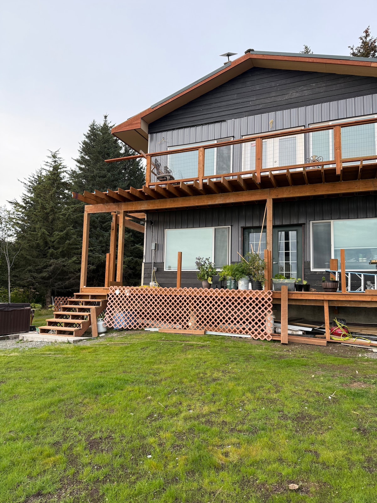 Please come and enjoy our modern and unique vacation getaway! 3 minutes from downtown Homer and 10 minutes from the Homer Spit. Close to town in a quiet neighborhood with views of Kachemak Bay. -1 King size bed -1 Queen size bed -1 twin bed -1 bathroom w/ rain shower -Open concept living area -Space saving staircase -Modern natural gas fireplace -Smart TV -Full kitchen -High speed wifi -Free parking -Key code access -Nordic Spa w/ hot tub, sauna&cold plunge