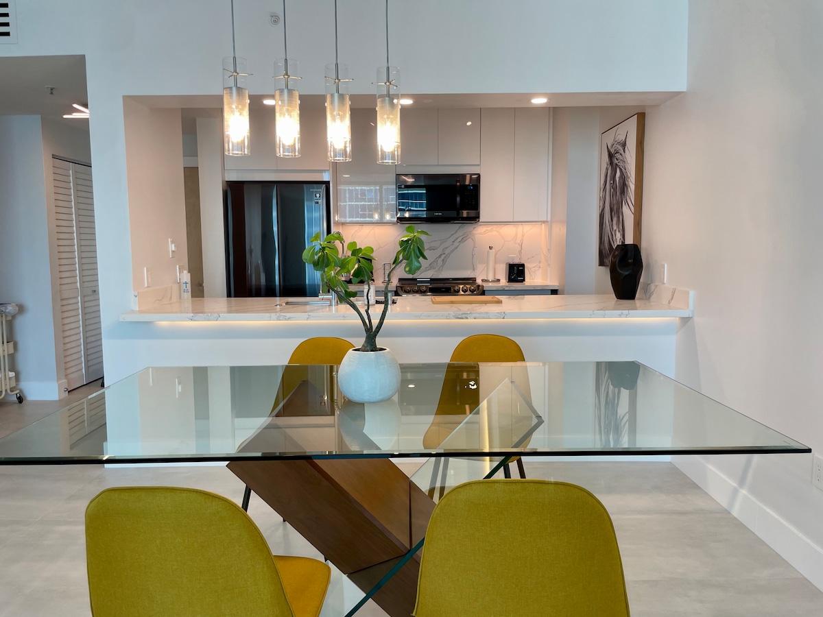 Entire luxury condo at Quadro in the Design District. Fully equipped - Free parking, coffee, Wi-Fi & cable. The building features amenities in the 6th floor including a fitness center, a lounge with co-working area & a game room, an outdoor dining area with BBQ's and a great pool.Enjoy guest exclusive neighborhood discounts. Walk to hundreds of designer shops, restaurants, bars, art galleries, & more! 10-min drive to Miami’s international airport, 15-min drive to Miami Beach.