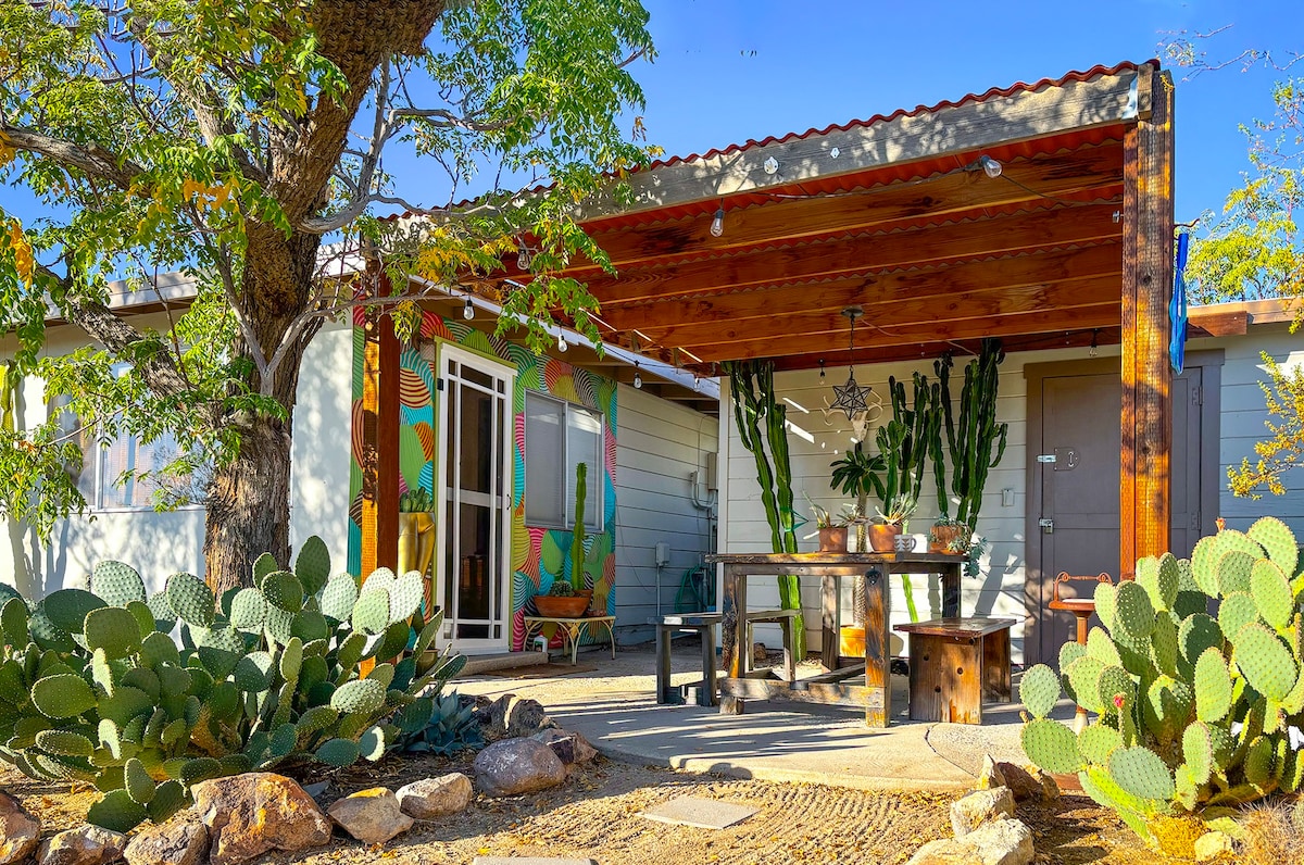 Welcome to Coral & Cacti Ranch - The Jungalow of Joshua Tree. Make your own pizzas and enjoy gorgeous desert vistas on our hanging beds. Soak in a sky full of stars in our hot tub or cowboy pool. This colorful bohemian retreat is a guest favorite. - wood fire pizza oven - outdoor shower - fire pit - hot tub under the stars - huge patio w/hanging beds - cowboy pool - projector to stream, bring laptop - fast wifi - double indoor shower - hammocks Voted one of the Best Airbnbs in Joshua Tree.