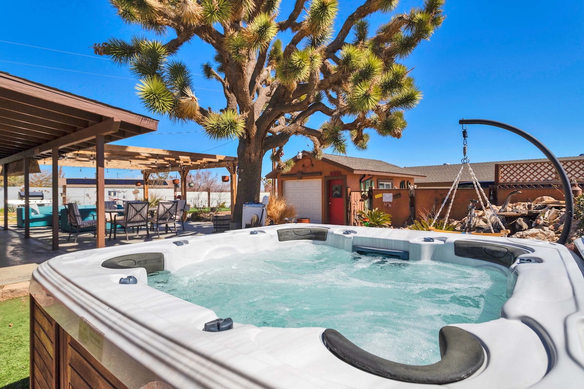 THE HOUSE OF KINDNESS is a high desert time machine (as seen on Airbnb TV Ad)! Experience the epic decades of the 60's and 70's in our original 1973 stucco home. Fully restored and set amongst the beauty of the expansive high desert! Lounge on the carpet while listening to vinyl, relax in the hot tub, stargaze in the hammock garden, or soak in one of our 4 clawfoot tubs. Designed and curated by visual artists Asher Moss & Melodi Meadows. JT Park and Pappy & Harriet's are 15 minutes away.