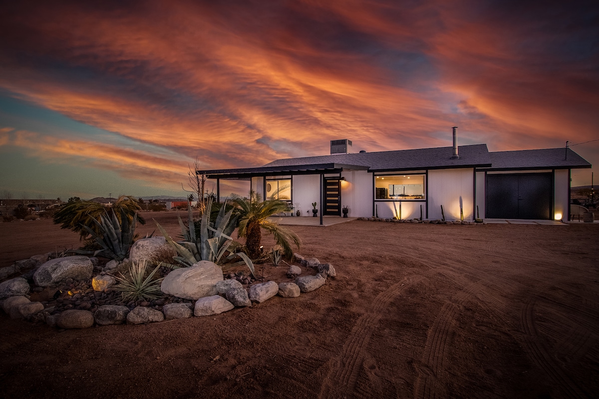+ Brand new fully loaded luxury home + 10 private acres w/ 100+ Joshua Trees + Hot tub + Cowboy tub pool (open for the summer!) + Propane firepit & BBQ + Outdoor stargazing chairs + Custom lounging deck + Fully-equipped kitchen + Secluded location near all Joshua Tree attractions 10 mins ➔ La Copine 10 mins ➔ Integratron 10 mins ➔ Giant Rock Meeting Room 20 mins ➔ Joshua Tree Village 20 mins ➔ Giant Rock 25 mins ➔ Joshua Tree National Park 25 mins ➔ Pappy & Harriet's 25 mins ➔ Pioneertown