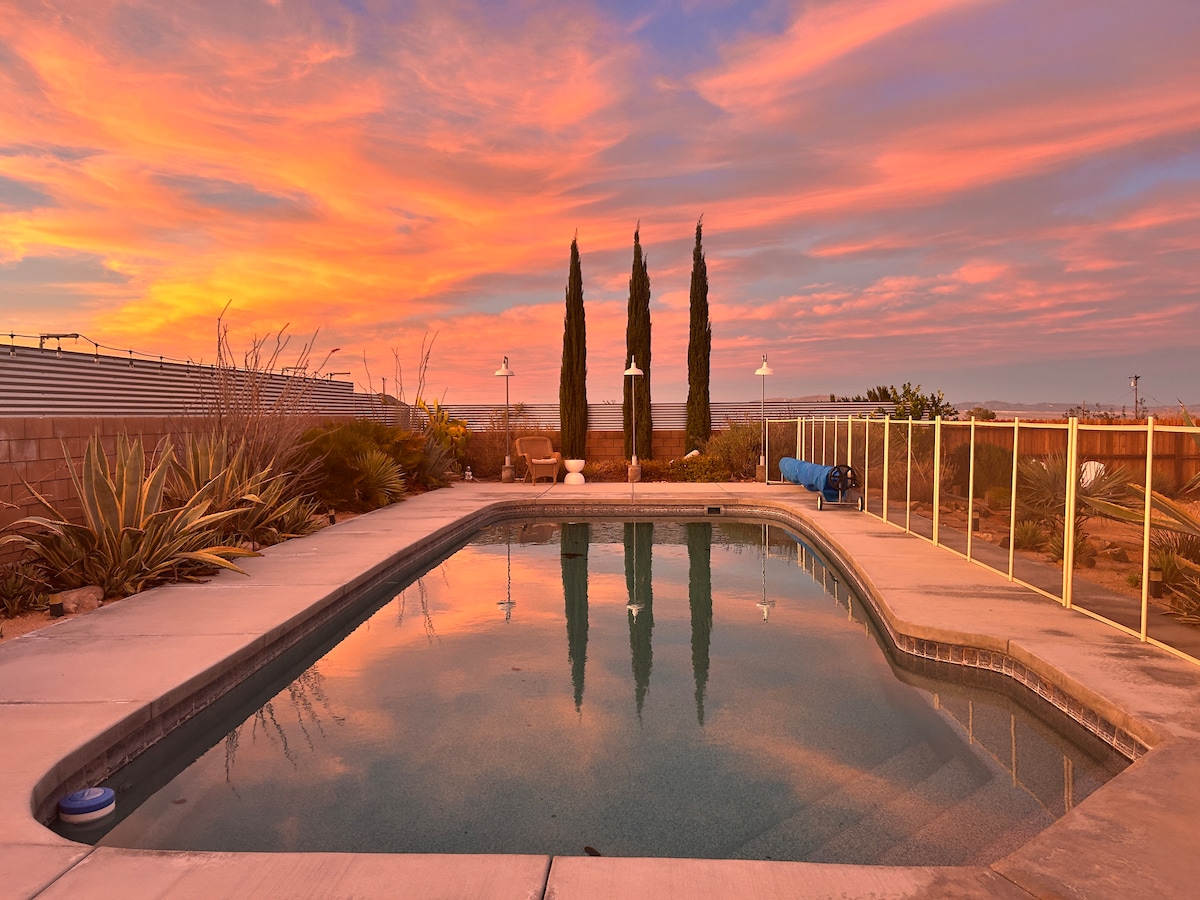 A unique & unforgettable desert experience with stunning views from the heated pool and in-ground salt water spa deck *Enjoy spectacular sunsets and stargazing by an open fire. *STARLINK WiFi *Separate Activity & Movie room. *Take beautiful canyon hikes in solitude right from the front door through the Sand to Snow National Monument. This 5 acre property is private, quiet and peacefully nestled amongst and surrounded by huge boulders and wildlife on a hillside overlooking the desert for miles.