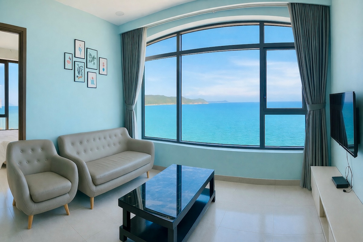 JB Azure Xin chào! A 29th-floor apartment with a panoramic ocean view, every room opens to the deep blue sea. Here you can soak in the sunrise right from the sofa and step onto the white sands just by crossing the road. Set within a vibrant new coastal neighborhood, you’ll find fresh local produce, and cozy eateries at great prices, all surrounded by a warm community of international long-stays travelers. A peaceful hideaway that captures the serene charm and colors of the Côte d’Azur.