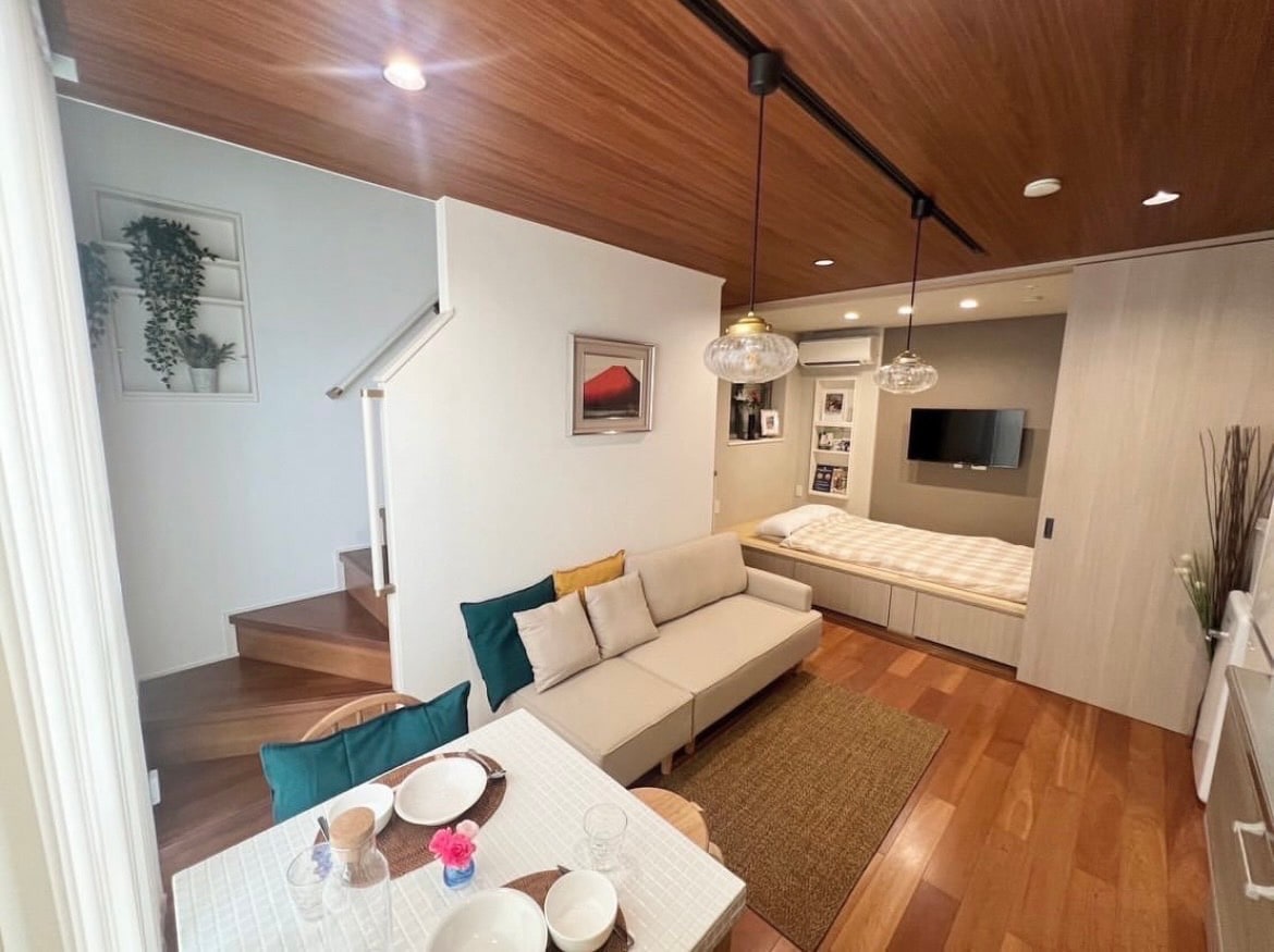 Just 5 minutes from Nakano-Shimbashi Station (Marunouchi Line), this 27㎡ 1K apartment is only 2 stops from Shinjuku yet located in a quiet residential area. It features wood-style floors, soft lighting, and south-facing windows with plenty of sunlight. Two semi-double beds sleep up to 4 guests. Soft pink and green tones create a cozy feel. Includes a compact kitchen, fridge, microwave, high-speed Wi-Fi, and smart TV—ideal for couples, friends, or small families.