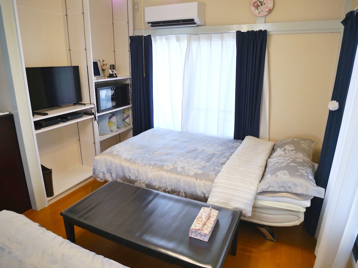 An apartment located in a very convenient location. There are two stations nearby. 6 min walk to the nearest station Yoyogi-Koen station, where you can go to Harajuku in 2 min by train, and 9 min walk to the Sangubashi station, where you can go to Shinjuku station in 4 min by train. Provides FREE high speed internet & Wi-fi. This apartment is self-check-in. There are a double sized bed and a single sized bed in the bedroom, and a double-sized sofa bed in the living room.