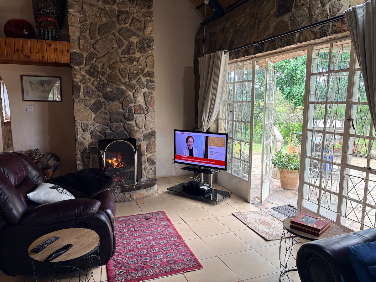 Escape to our delightful wooden cabin, perfectly nestled among majestic msasa trees and stunning granite outcrops. Step into the sunlounge and soak in the views over the pristine miombo forest, where you can unwind and enjoy a morning coffee while listening to the symphony of nature. The towering granite monoliths of Susurumba guard this tranquil retreat, providing a breathtaking backdrop for your stay. Hiking the trails starts at your front door followed by evenings in front of the fire.