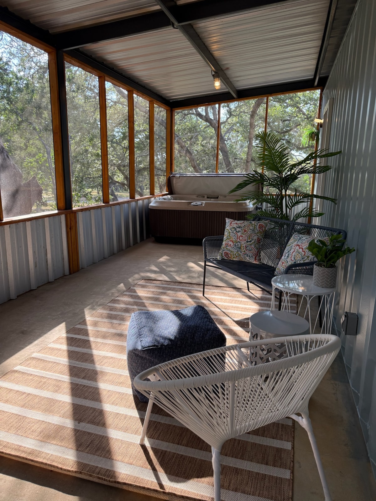 Tucked away at the back of the property, the “Tiny Farmhouse” is located furthest from our other homes and offers near-total seclusion and privacy. Relax with your morning coffee under a canopy of oaks as you watch the birds start their day or catch a glimpse of one of our Longhorns, goats, or blackbuck antelope. At night, slip into the hot tub and stare at thousands of twinkling stars under the big Texas skies as the howls of distant coyotes keep you company.