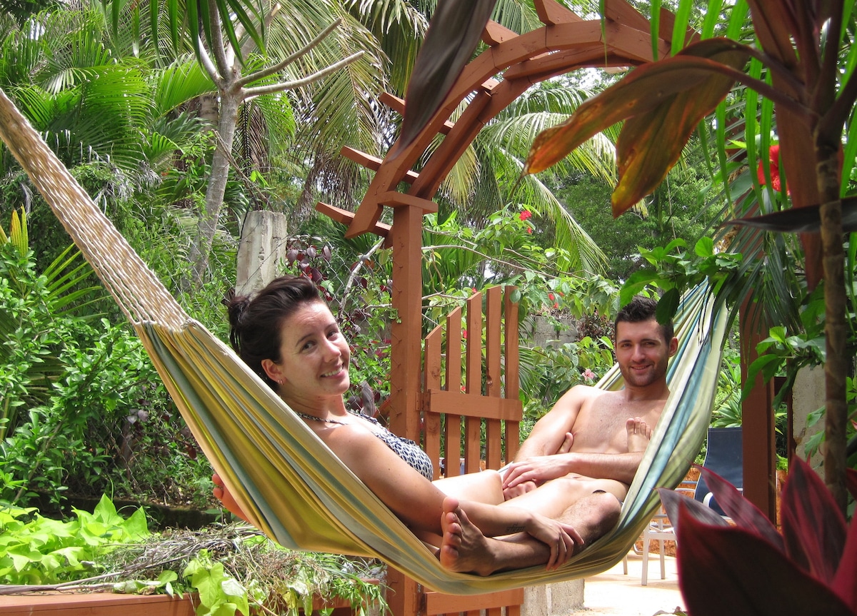 La habitación es totalmente nueva, ubicado en el mejor lugar de West End! Half Moon Bay, el mero corazon de West End. Nuestra casa se encuentra rodeada por árboles grandes donde vas a ver loros, colibrís, iguanas y otros animales. Los árboles y la privacidad del lugar protege de los sonidos de la vida nocturna. Tiene acceso a una terraza amplia donde puedes disfrutar en privacidad o invitar a amigos. Todo cerca, la playa, restaurantes,tiendas, supermercados pero en un lugar tranquilo y privado.