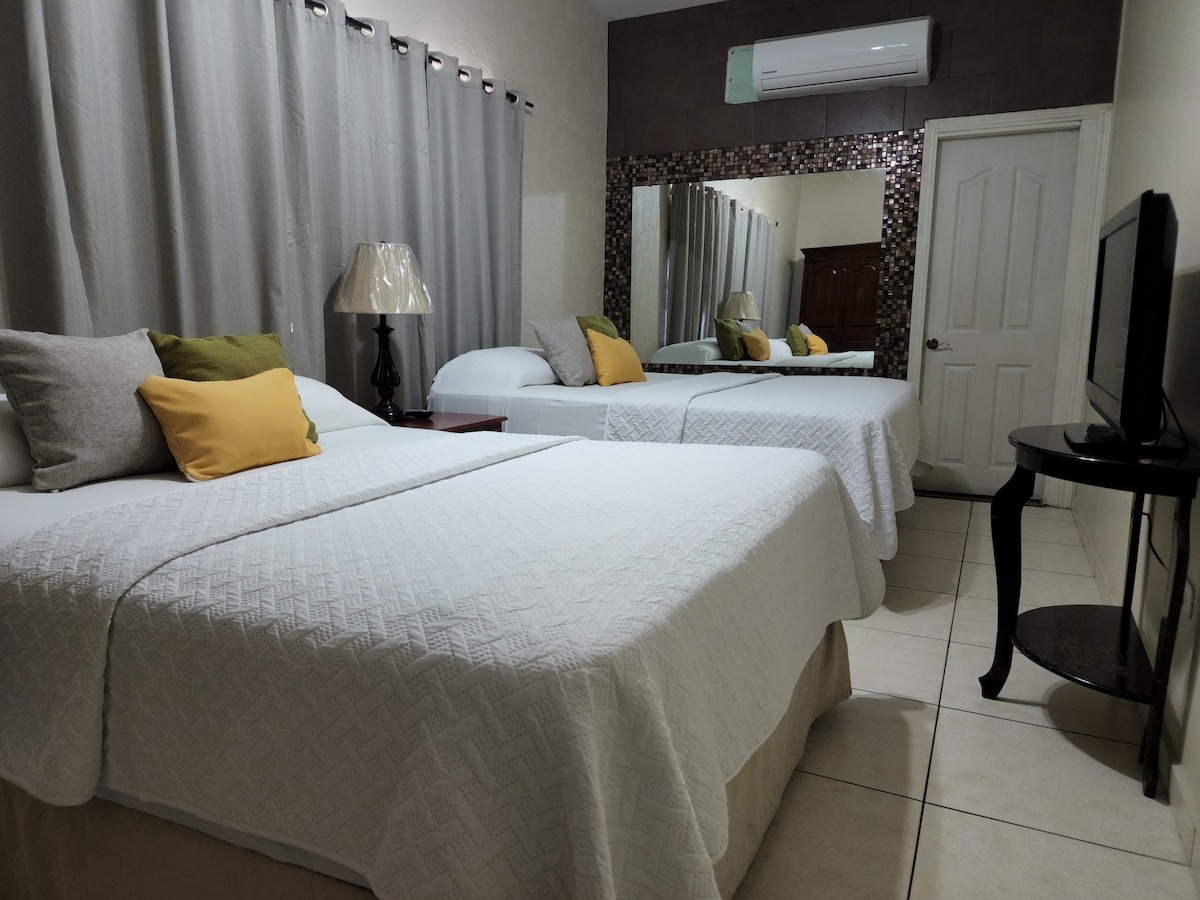 Our room is private and has two Queen beds, a wide and private bathroom with hot water, a 32" LED TV with cable, closet, wi-fi, and air conditioning. We are located near the City Mall, the Zona Viva, the Grand Central Bus Station, Copantl Hotel & Convention Center, hospitals, banks, the downtown, among others. We also have an energy plant.