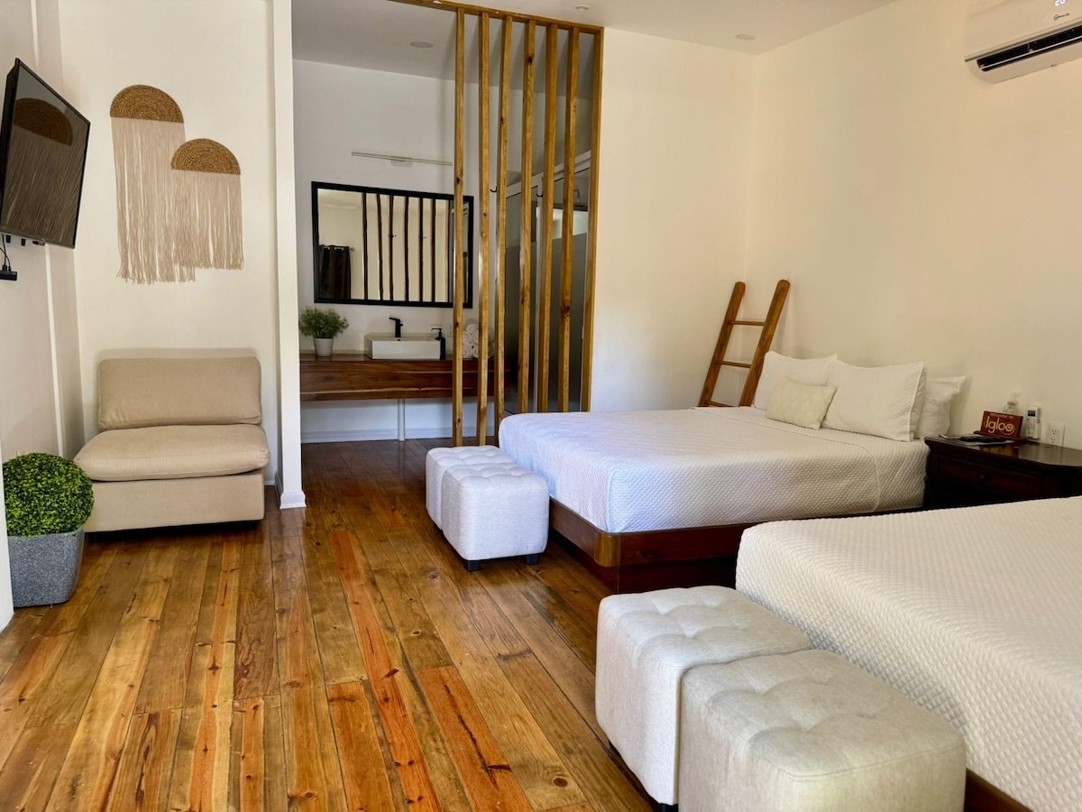 Room 1 at Igloo Island Domes offers a spacious and tranquil retreat in Utila, ideal for families or couples. This comfortable room features two queen beds and a private bathroom, providing a relaxing stay with air conditioning and fresh linens. Guests have access to the outdoor swimming pool, sun terrace, and garden. Located near Dream Ferry and local restaurants, the property offers personalized hospitality from a local host for an unforgettable experience.