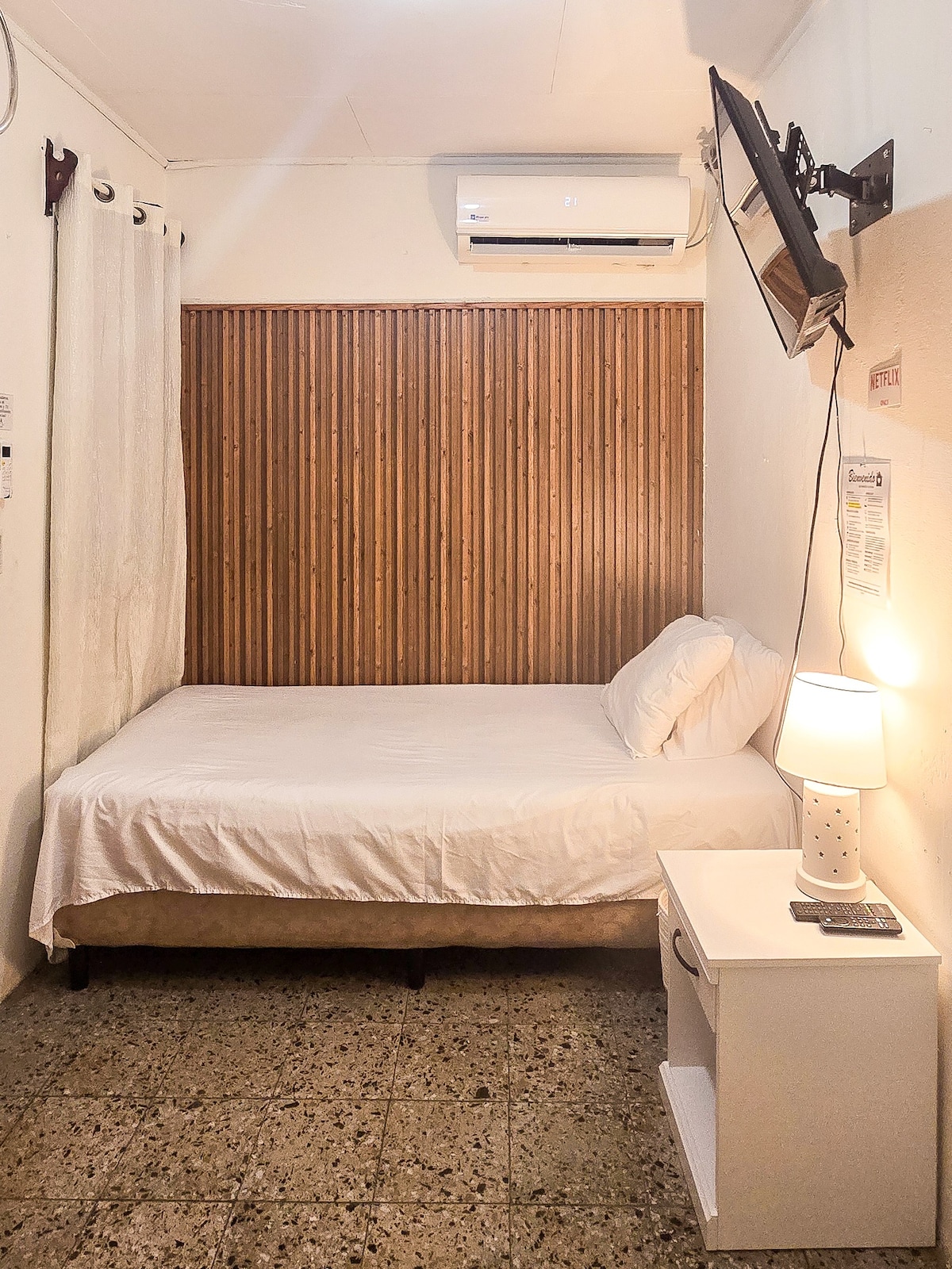 Enjoy our cozy accommodation in the best area of the city!!, surrounded by squares, businesses, supermarkets, cinemas, restaurants, bars and nightclubs. All in less than 5 minutes! 🏡 SMALL room FOR 1 PERSON with bathroom and own service, the room has NO separations between said spaces. Individual entry. ✅It has a SINGLE bed, TV, high-speed Wifi and air A/c. ✅ We have a recreation area with an outdoor table, security and private parking.