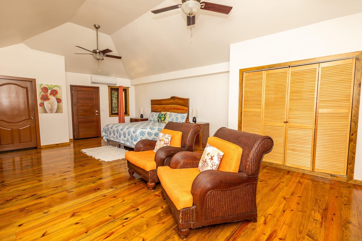 This cozy casita (studio) has a warm tropical feel. It's near the pool but not too close. It has a fully equipped kitchenette with everything you need to prepare meals and keep you're drinks cold. The bathroom has a large shower and plenty for room you to get ready for your night in West End. Sip on your morning coffee on your private deck and watch the wild macaws fly in for their morning visit. The lush jungle is all around you with the breezes to keep you cool while you relax in the hammock.