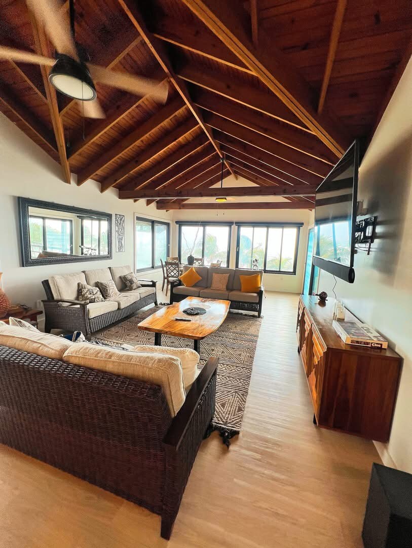 Esta es la Vida (“This is the Life!”) is a brand new five bedroom ocean front luxury villa. Cathedral ceilings and accordion glass doors blur the lines between your indoor and outdoor space. The white sand area in front of the house allows you to enjoy a game of volleyball or cornhole. Kayaks and paddle boards are provided for our guests and it's an easy paddle out to enjoy the reef. Watch while you are paddling as you might spot a spotted Eagle Ray or a pod of dolphins joining you.