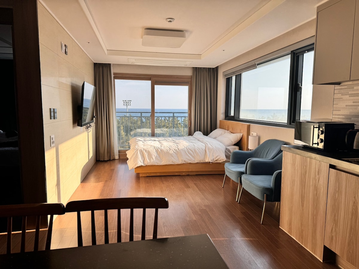 🌊 Cheongcho Lake View Residence – 3Room Royal Suite 🏖️ Exclusive suite with rare views of the East Sea and Cheongcho Lake Perfect for families. 🛏️ All bedding is replaced with fresh sheets after every stay, ensuring a clean, hygienic space 💙 🍳 Light cooking allowed. For strong-smelling food, use the 1F Cooking Studio (₩3,000 per person), equipped with tableware. 💦 Guests enjoy free use of the pool (Nov–Apr closed) and hot spring sauna (Airbnb only). Relax and enjoy the views 🌅